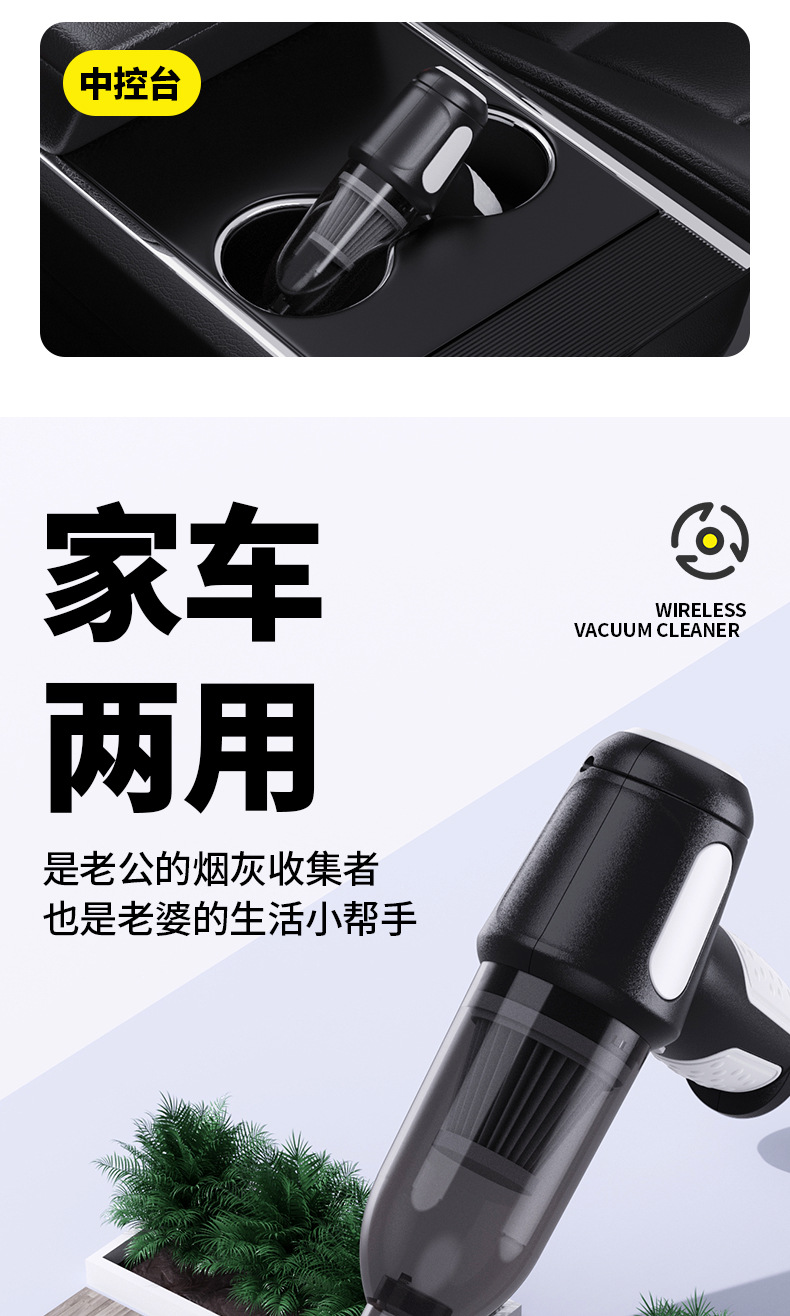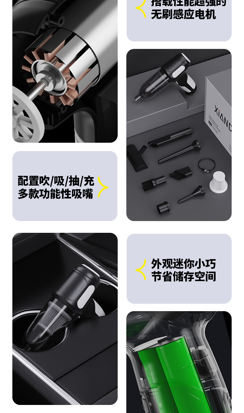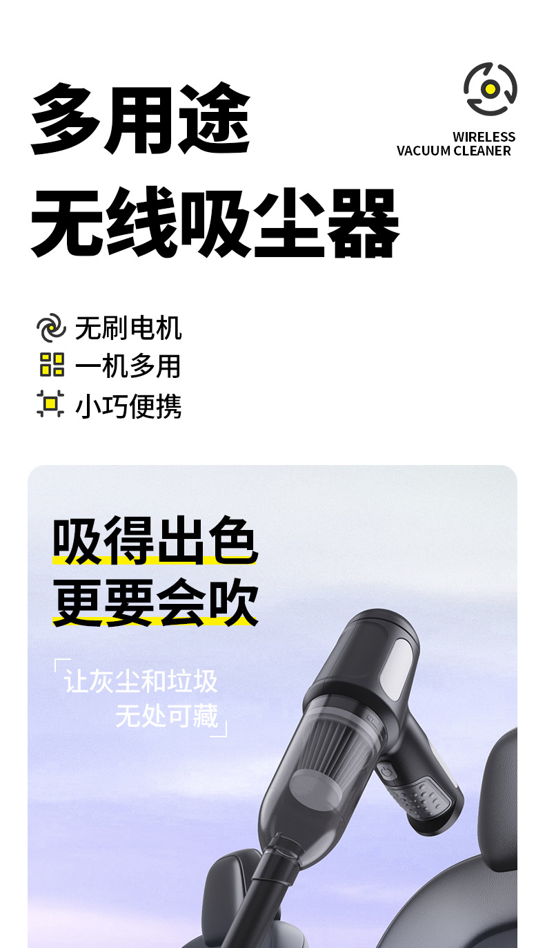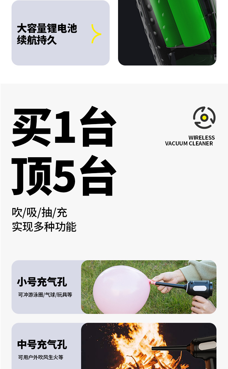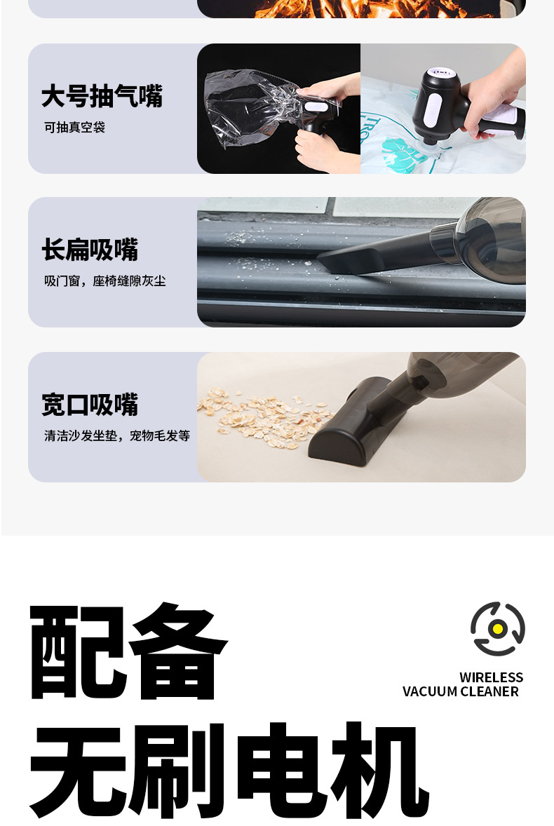 【无刷款包装清单】:吸尘器主机*1、地刷*1、长扁吸嘴带毛刷*1、长款吹嘴带毛刷*1、小号充气嘴*1、真空抽气嘴*1、Type-C接口充电线*1、中英说明书*1